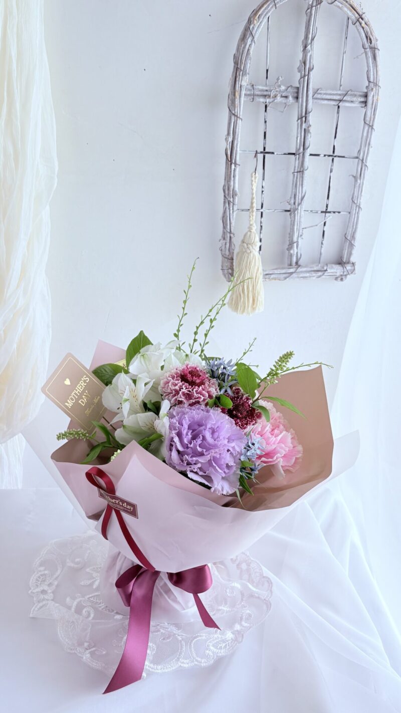 優しいデザインの母の日デザインブーケは、ラッピングのそのままで飾れる花束です。